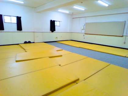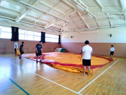 本日午前中、武道場ではレスリング部の生徒が、普段活動をしている部屋のマットをきれいに敷きなおすために、シートを広げる作業をしていました。大きく重たいシートを数人がかりで運び出し、丁寧に作業していました。