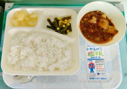 ※本日のハヤシライスには、「ラッキーベジタブル」と呼ばれる、かわいい形に型抜きされた野菜が入っていました。残念ながら職員室の給食には入っていませんでしたが、かわいいにんじんが入っていた人はいましたか?