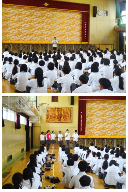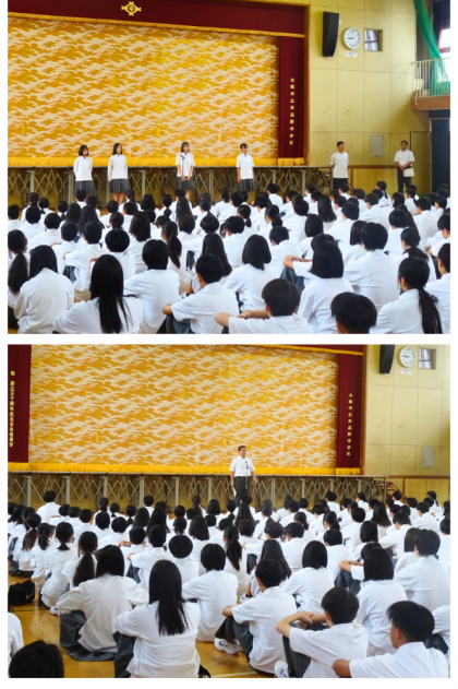 今、舞台には合唱コンクールのひな壇の準備がされています。こういった準備は、誰かがしてくれているものです。準備をしてもらうことは、当たり前ではありません。また、授業が受けられることも当たり前ではありません。準備をしてもらっている、教えてもらっているという気持ちをもって取り組んでください。名札やボタンについて声掛けをするのは、社会人になった際、きちんとした身だしなみができるよう声かけをしています。集会に遅刻せず時間を守るように声をかけるのも、社会人になった際に遅刻をすれば、信用してもらえなくなるからです。信用してもらえなければ、意見も通らなくなります。みなさんには、信用される人間に成長して欲しいです。事情がある場合は、必ず連絡をしましょう。気をつければ解決する理由であれば、気をつけて行動しましょう。