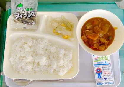 ※本日のチキンカレーライスには、「ラッキーベジタブル」と呼ばれる、かわいく型抜きされた野菜が入っていました。今回は職員室の給食にも、星型のにんじんが入っていたそうです!教室でも、かわいく型抜きされた野菜が入っていた人はいましたか?