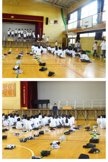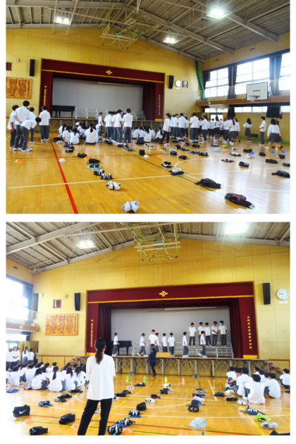 みなさんの入退場を見ていると、しゃべりながら歩いている人や、笑いながら歩いている人がいました。入退場の仕方や、鑑賞態度も採点の対象になります。意識を変え練習してください。この後、授業が始まります。次は授業の頭に意識を変えて、速やかに授業の準備をしてください。