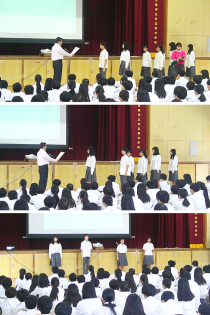 先週、時間について話をしました。集会の日は、8時40分集合点呼完了です。今日はどうでしたか?私は、全体的に早くなったと感じました。しかし、まだ遅れてくる生徒もいます。静かに話を聞いている最中に、遅刻して登校し足音を立てて入ってくれば、みんな気になります。今のように静かに話を聞けていれば、集中して聞くことができています。集会では、校長先生や学年の先生がいろいろな話をしてくださいます。これは当たり前のことではありません。社会人になれば、このように話してもらう機会はなくなります。遅刻せず登校し、静かに話を聞くことを当たり前にしてください。