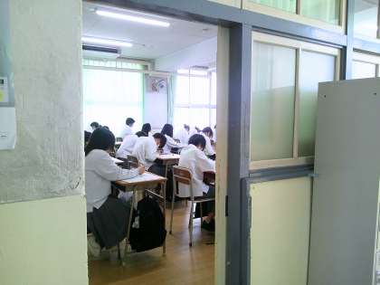 写真は、上から順に1年生、2年生、3年生の数学のテストの様子です。みんな集中してテストに取り組んでいました。
