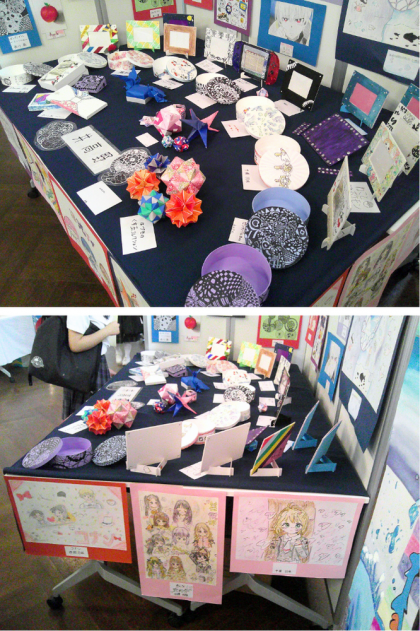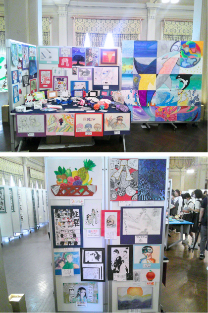 写真は美術部の作品展示の様子です。部員みんなで力を合わせ完成させた大きな絵やイラスト、写真立てや折り紙などの作品が展示されていました。いずれの作品も、いろとりどりで個性あふれる力作ばかりでした。