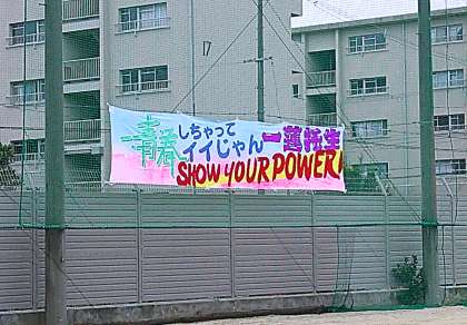写真は、入場行進の様子と美術部が作成してくれた体育大会スローガンです。