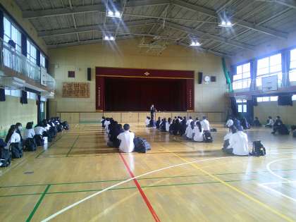 ※写真は、出発の様子と、帰校後に体育館へ集合した際の様子です。