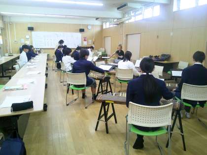 11月10日(月)から11月13日(木)までの4日間、講師の先生にお越しいただき、1クラスの人数を半数にして、1・2年生の全クラスの生徒を対象に、箏の授業をしていただきます。