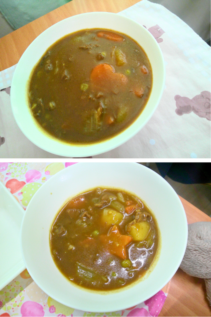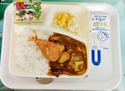 ※本日のカレーには「ラッキーベジタブル」と呼ばれる、かわいく型抜きされた野菜が入っていました。3年3組の教室で、ラッキーベジタブルが入っていたとの情報を受け、写真を撮らせてもらいました。星形とハート型のにんじんが見えるでしょうか?