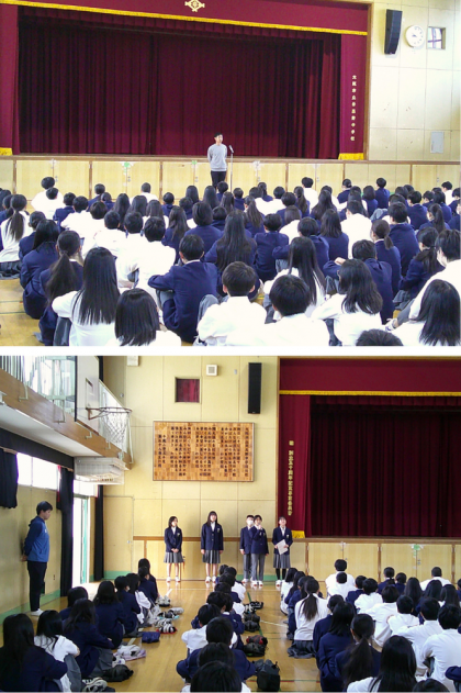 また、1カ月ほど早くインフルエンザが流行しているとのことです。大阪市でも注意レベルを超えています。うつらない、うつさないよう、一人一人が体調管理をしてください。そして期末テストでは、実力を発揮できるように頑張ってください。