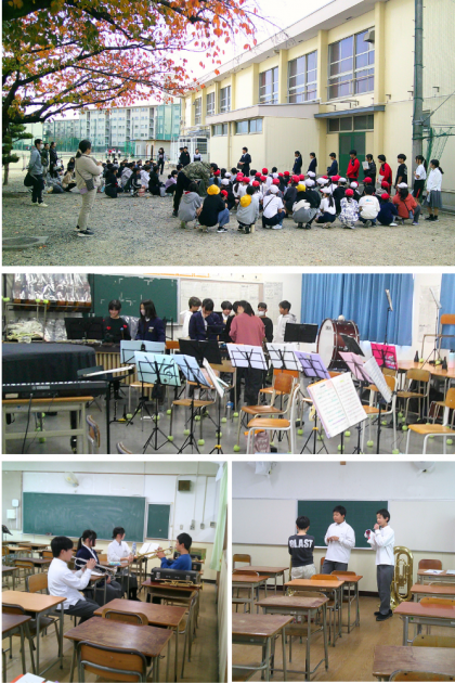 写真は、体験開始前の説明の様子と吹奏楽部の体験の様子です。