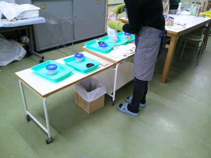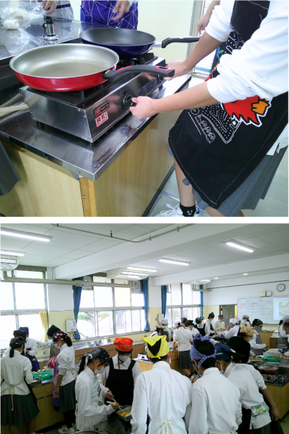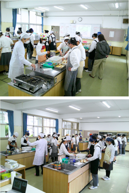 5枚目の写真は、お手伝いに来てくださっていたボランティアさんの作業の様子です。生徒が調理しやすいよう、事前に各班の材料を計量し、必要な食材を準備してくれていました。本日も多くのボランティアさんとサポーターさんが調理実習の補助に入ってくださいました。準備段階から最終片付けまで、ご協力いただき誠にありがとうございました。