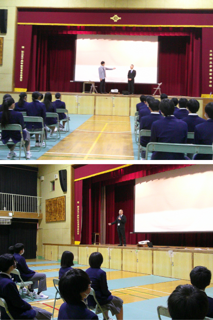 本日6時間目に、高校の先生にお越しいただき、3年生を対象にマナー講座を実施しました。まず初めに、コント仕立てで悪い面接態度の例を実演してくださいました。その後、面接の種類や、適切な身だしなみ、入室から退室までの面接の流れなどを、ポイントを交えながら説明してくださいました。