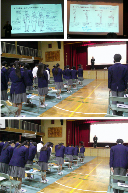 4つのあいさつ(礼)の種類を教わり、3年生全員で練習をしました。座る際の注意点や、立ち上がる際に美しく見える方法、質問への答え方や、志望動機を考える際のポイントなども詳しく教えていただきました。