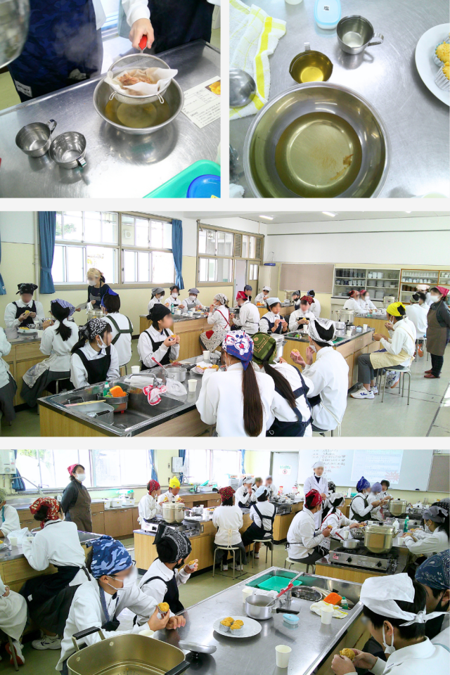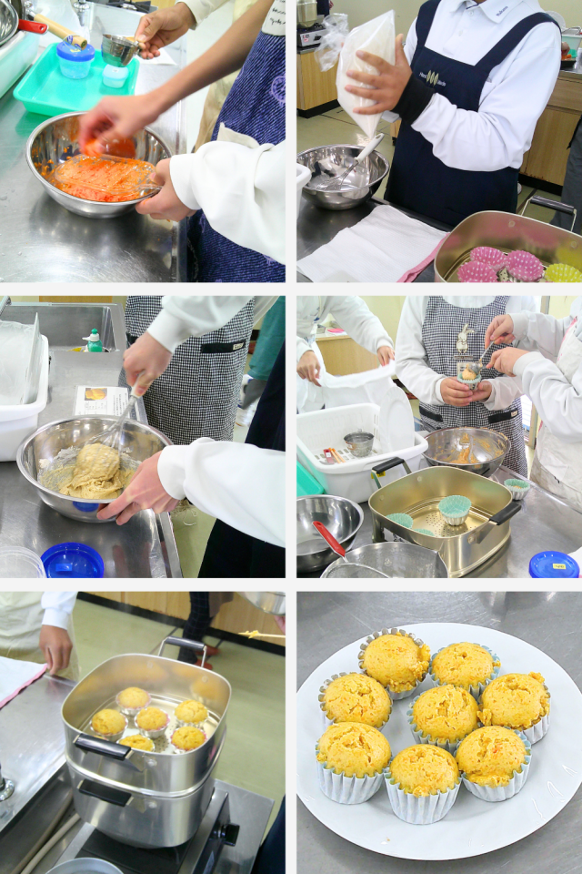 本日2、3時間目に3年1組の家庭科授業で調理実習を行いました。蒸し料理と幼児のおやつの学習として「にんじん蒸しパン」を作りました。本日の材料には、馴染みのある上白糖やサラダ油、牛乳の代わりに「てんさい糖」「太白ごま油」「無調整豆乳」が使われました。調理方法の説明を受け、作業を分担し調理に取りかかりました。次にどんなことをしておくべきか考え、互いに声を掛け合いながら行動しました。にんじん蒸しパンを蒸している間に、「こんぶだし」と「かつおだし」を使った、だしの実験をしました。それぞれ小鍋にだしを作り、単品で飲んだ場合、合わせて飲んだ場合、塩を少し入れて飲んだ場合は、どんな風に味や舌触りが変わるのかを考えて飲み比べました。その後、出来上がった蒸しパンを実食しました。優しい甘さで、ふわふわモチモチの蒸しパンでした。