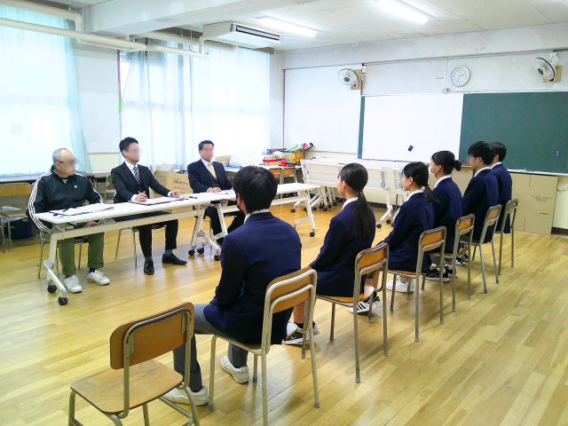 本日6時間目に、3年生の校長面接を実施しました。2日目となる本日は、3年3組の生徒が練習を行いました。事前に入退室の仕方や、質問への答え方を予習し、緊張しながらも、しっかりと受け答えすることができていました。校長先生からは、さらに印象を良くしたり、思いを伝えたりするためにはどうすればいいかアドバイスいただきました。