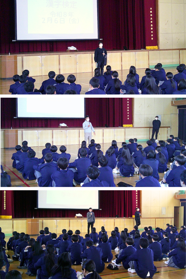 2月6日(金)に2年生全員で漢字能力検定を受検します。以前、漢字能力検定の方から「先生の学校は合格率が高いので取材させてください。」と言われたことがあります。しかし、合格率を高くしたのは、受けたみんながそれぞれ頑張って勉強したからです。漢字は数が多く、その日の問題は解けても、翌日取り組んだ問題は解けないこともあります。インターネット上で過去問が紹介されているので、必ず過去問を解き、どんな問題がでるのか確認してください。全く違う勉強をしていても合格に繋がりません。チャレンジテストの勉強の合間に少しづつでも取り組んでください。