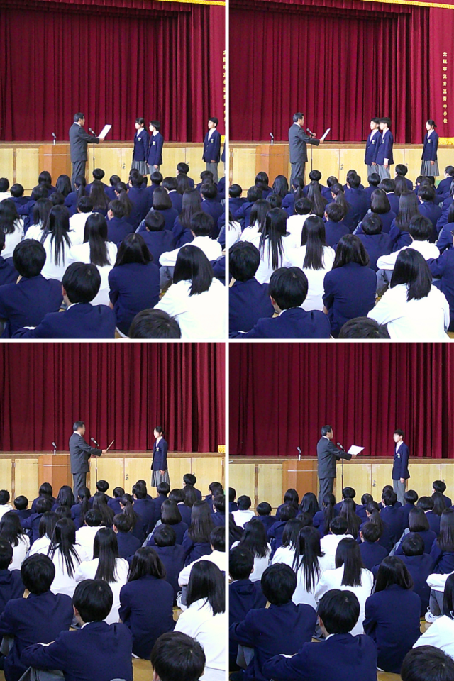 また、二学期もたくさんの賞状を渡すことができました。みなさんの頑張りのおかげです。令和8年も、それぞれが目標を持ち、いろいろなことにチャレンジしていってください。寒い日が続き、感染症が流行しています。長期休みには不規則な生活をおくりがちですが、体調管理に気を付け、楽しい年末年始を過ごしてください。交通事故や事件に巻き込まれないようにし、3学期も再びこの場で元気なみなさんの顔が見られるのを楽しみにしています。