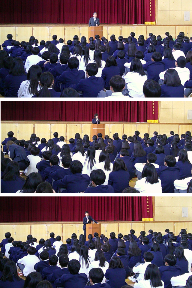 さて、2学期最後の日となりましたが、みなさんにとってはどんな2学期でしたか?合唱コンクールや文化祭、体育祭など大きな行事がたくさんありました。目標に向かいコツコツと努力を重ね、協力して参加してくれましたね。周りのみなさんの協力があり、行事が実施できたことに感謝する気持ちも感じてくれたと思います。様々な経験の積み重ねが大切です。3年生は、最上級生として大変頑張ってくれました。ありがとうございました。来年は、先輩の良いところを引き継ぎ、1・2年生のみなさんで、さらによい学校行事を作っていってください。