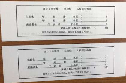 先日、生徒を通じてプリント「文化祭の入校証について」と入校証引き換え券2枚を配布しております。
