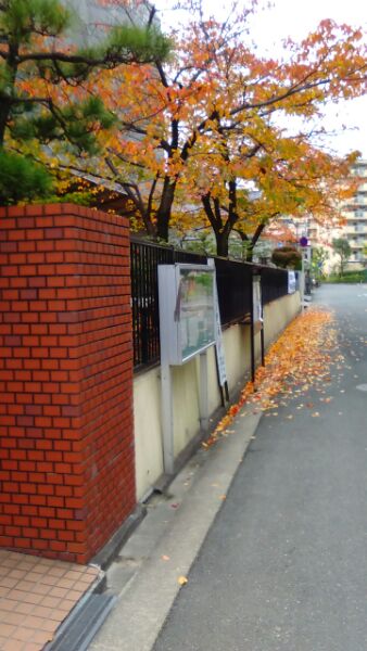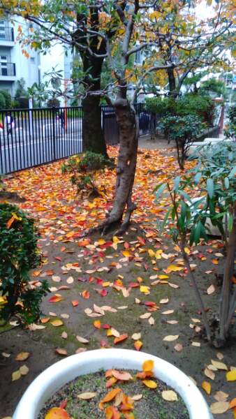 朝の正門前、落ち葉がたくさん積もっています。今日から期末テストです。社会、理科、保健体育、最後までがんばってください。