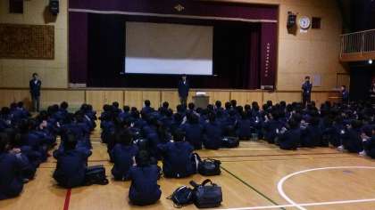 講演会では、防災・環境アドバイザーの岡本茂様にご講演いただきました。水害や津波、地震等の災害に関する基礎知識と災害時の井高野・東井高野地域の被害想定と災害時にどういった行動をとるべきか映像を使いながらわかりやすくお話していただきました。講師の岡本様は、地形等の自然科学的見地からまちの防災を研究し、東淀川区の地域防災計画を策定される等広く活躍されている方で、生徒たち地震や水害の恐ろしさと自分たちの町の被害想定についての話を真剣に聴いていました。