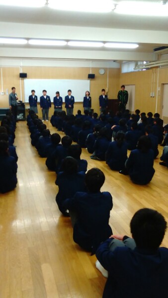 3年生も参加する最後の部活動集会の様子です。部長団団長も3年生から2年生に引き継がれました。