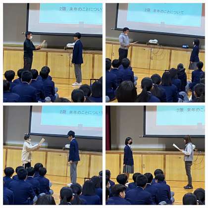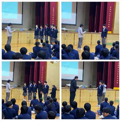 本日1、2時間目に2年生の2学期最後の学年集会がありました。まず始めに、校外学習や文化祭、合唱コンクール、学校生活で特に素晴らしかった班や生徒の表彰式を行いました。