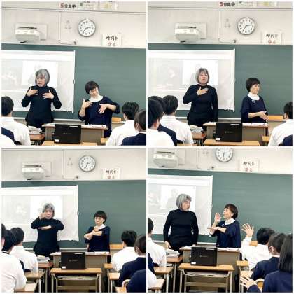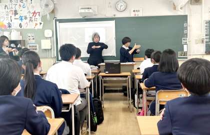 本日6時間目に、手話サークルすみれの皆様に講師としてお越しいただき、3年生を対象に聴覚障がい教育を実施しました。本日の講義は、聴覚障がいについて基本的な知識や社会生活を営むうえで必要な知識を習得し、周りには様々な立場や状況に置かれている人がいることを知り、自他の違いを正しく捉え、互いに助け合うことで成り立っていくことに気づくことを目的として実施しました。