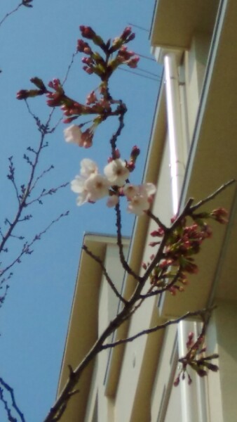 学校の桜がやっと開花しました。1週間後の入学式には見ごろを迎えそうです。