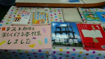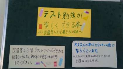 図書室では「テスト勉強が楽しくできる本特集です」が展示されています。