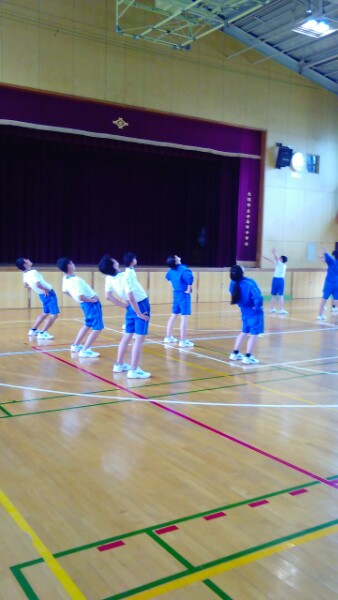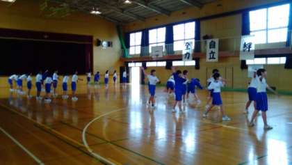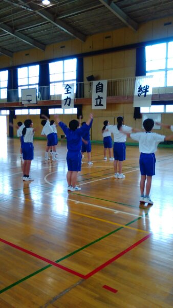 2年生の体育の授業です。班ごとにリーダーを中心に掛け声をかけて、体操の練習をしています。この後、体操のテストを行います。
