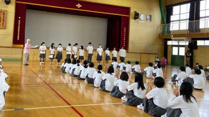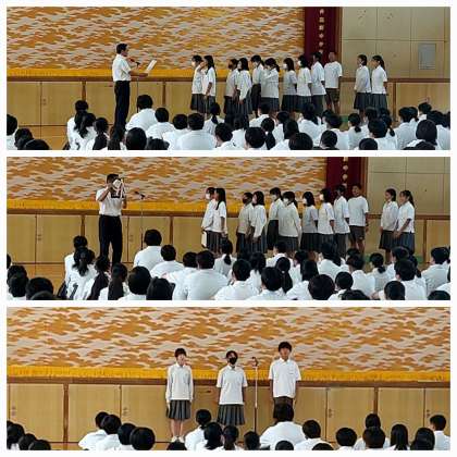 本日の集会では、英単語コンテストで満点だった生徒の表彰が行われました。