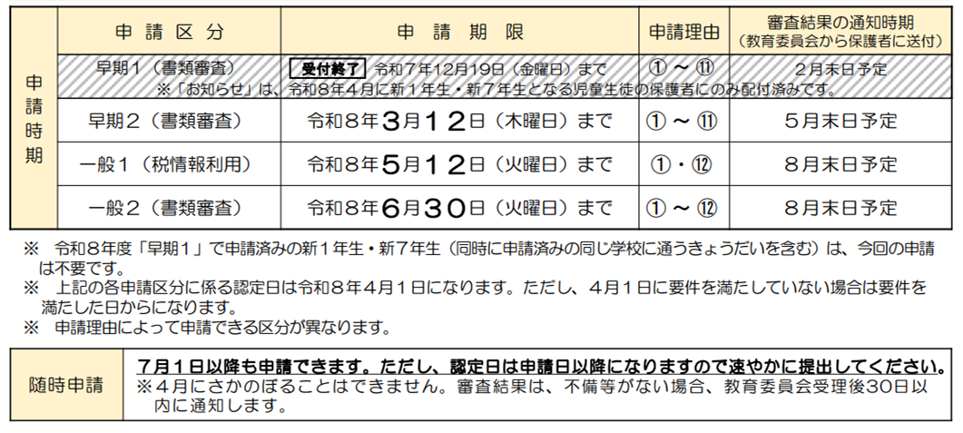 申請を希望される方は、期限に遅れないように学校事務室まで申請書をご提出ください。申請は毎年度必要です。