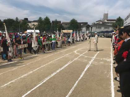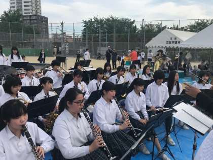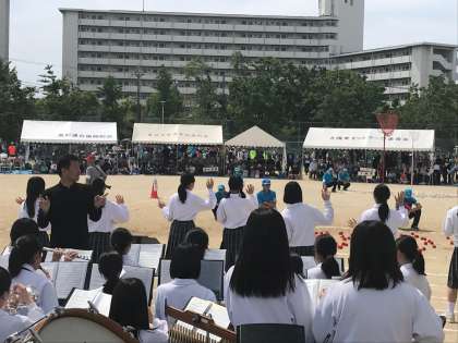 本校吹奏楽部がお招きいただき、開会式に引き続いて演奏(かわいいダンスも!)を披露しました。
