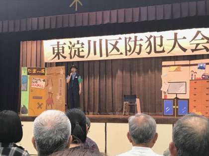防犯大会では、区長さんや警察署長さんのご挨拶のあと、府警本部の方々による寸劇で特殊詐欺についての防犯指導が行われ、本校吹奏楽部の演奏と続きます。