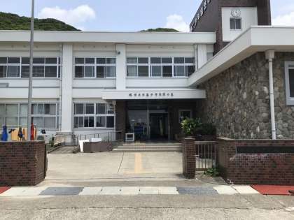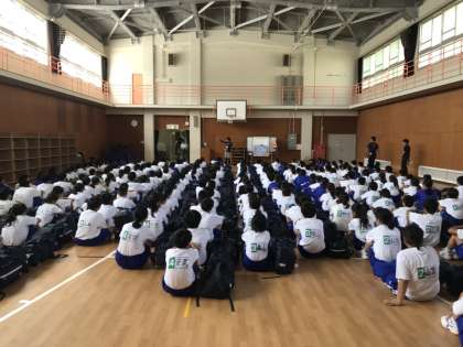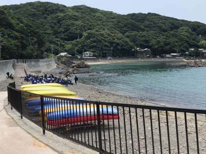 前の浜でお弁当を食べた後、自然の家での注意事項などを、スタッフの方々からお聞きしています。