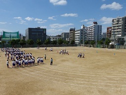 1週間後の体育祭に向けて、1年→3年→2年生の順で学年練習を行いました。写真は、3年生団体競技「台風の目」の練習の様子です。