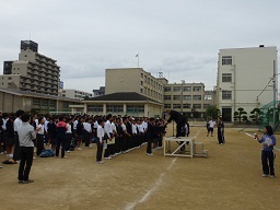 全校朝礼に先立って、部活動の成績に対して伝達表彰を行いました。