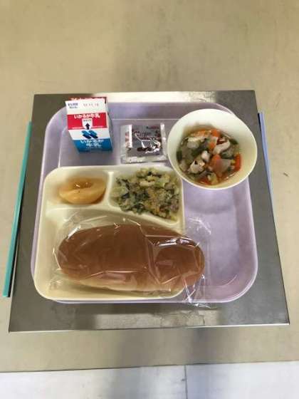ほうれん草のグラタン 白桃(缶) スープ煮 パン 牛乳 いちごジャム