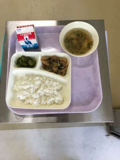 ホイコーロー 中華スープ きゅうりの辛みづけ ごはん 牛乳