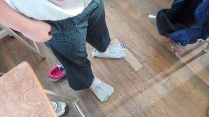 2.災害時にガラス片等から足を保護する簡易スリッパを作成した。新聞紙1枚でも緊急時には役に立つことを学びました。
