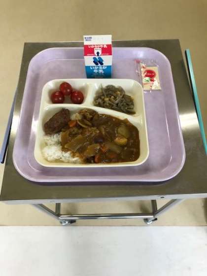 豚肉と金時豆のカレーライス(ごはん) 焼きミニハンバーグ ごぼうサラダ プチトマト 牛乳