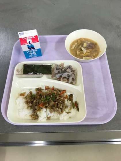 牛乳 鶏ごぼうご飯 みそ汁 焼きれんこん 焼きのり
