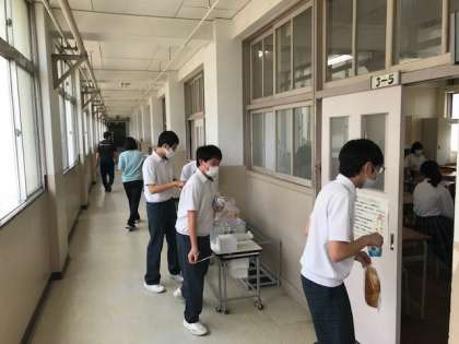 今日から通常の学校生活再開に向けた取り組みが始まりました。スタートアップ期間として二部制による授業で全学年行われました。併せて、給食も再開されました。これから徐々に色んなことが再開されていきますが、生徒のみなさんは熱中症も含めた体調管理に気を配り、感染予防に取り組んでいきましょう。
