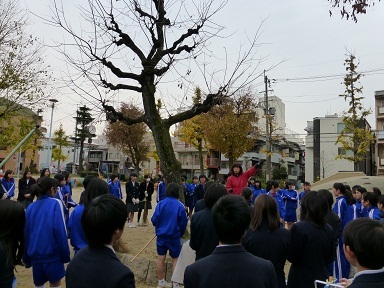 この時期、いちょうなどの樹木の落葉がたくさんありましたが、参加生徒たちは一生懸命に心を込めて清掃をしてくれました。寒い中、参加してくれた生徒のみなさん、ご苦労様でした。