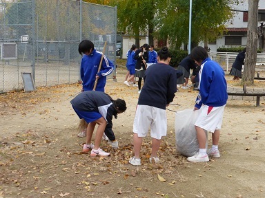 12月12日(金)に生徒会執行部役員の呼びかけにより、クリーン大作戦を展開しました。女子バレーボール部、女子バスケットボール部、水泳部などの各部員と一般のボランティア生徒を合わせて、約60名の参加があり、新東淀中学校近くの「北淀公園」で清掃活動を行いました。