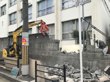 9月15日(火)から学校周りのブロック塀を取り壊す準備が行われ、本日より本格的に取り壊し工事が始まりました。取り壊し工事は学校の南東端から始まっています。生徒の皆さんは工事現場には近寄らず、周りに注意して登下校及び学校生活を送ってください。