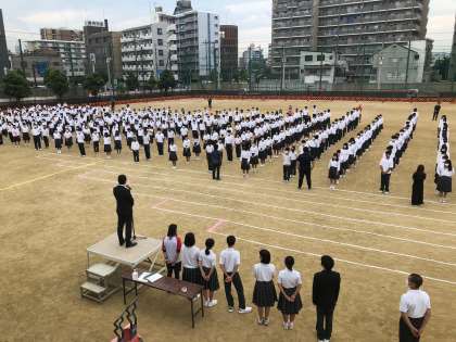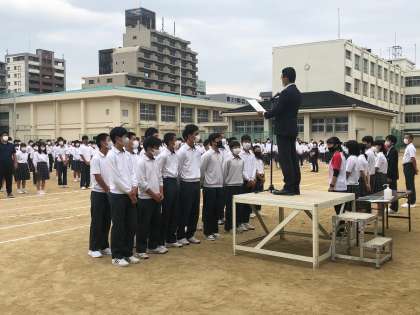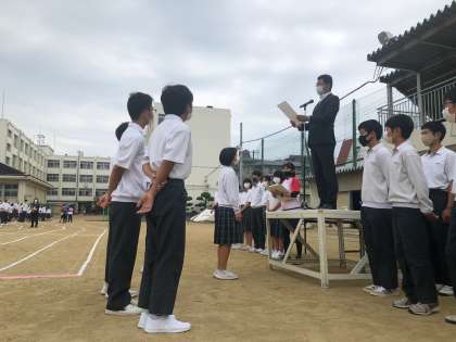 本日、久しぶりに、三学年揃っての全校集会がグラウンドで行われました。