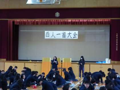 読み手の先生の声に、いかに早く反応するかがポイントで、写真からもわかるように生徒たちは、一生懸命に取り組んでいました。また、一首終わる毎に歓声やため息が上がり、百人一首を楽しんでいました。