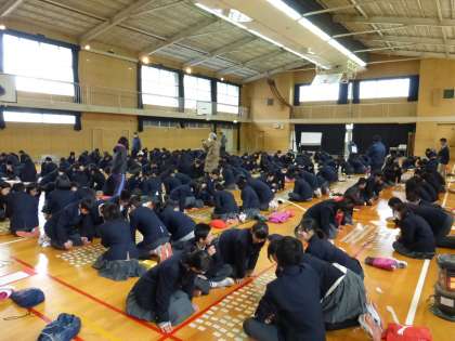 1月30日(金)5限目に体育館で「百人一首大会」を行いました。百人一首大会は、小倉百人一首をその難しさに応じて20枚ずつ5色に色分ける「五色百人一首」として行いました。2年生では各クラスで1A〜18Cに級分けをして、各級ごとに五色百人一首を行って、全級で獲得した札の枚数をクラス毎で競争することになります。もちろん、読み上げられた札を早く取った枚数ですが、お手つきをした時は、取った札から1枚を場に戻します。